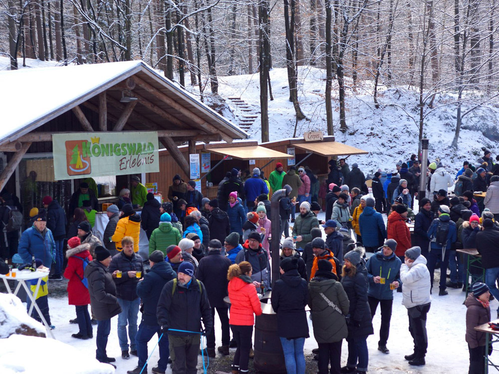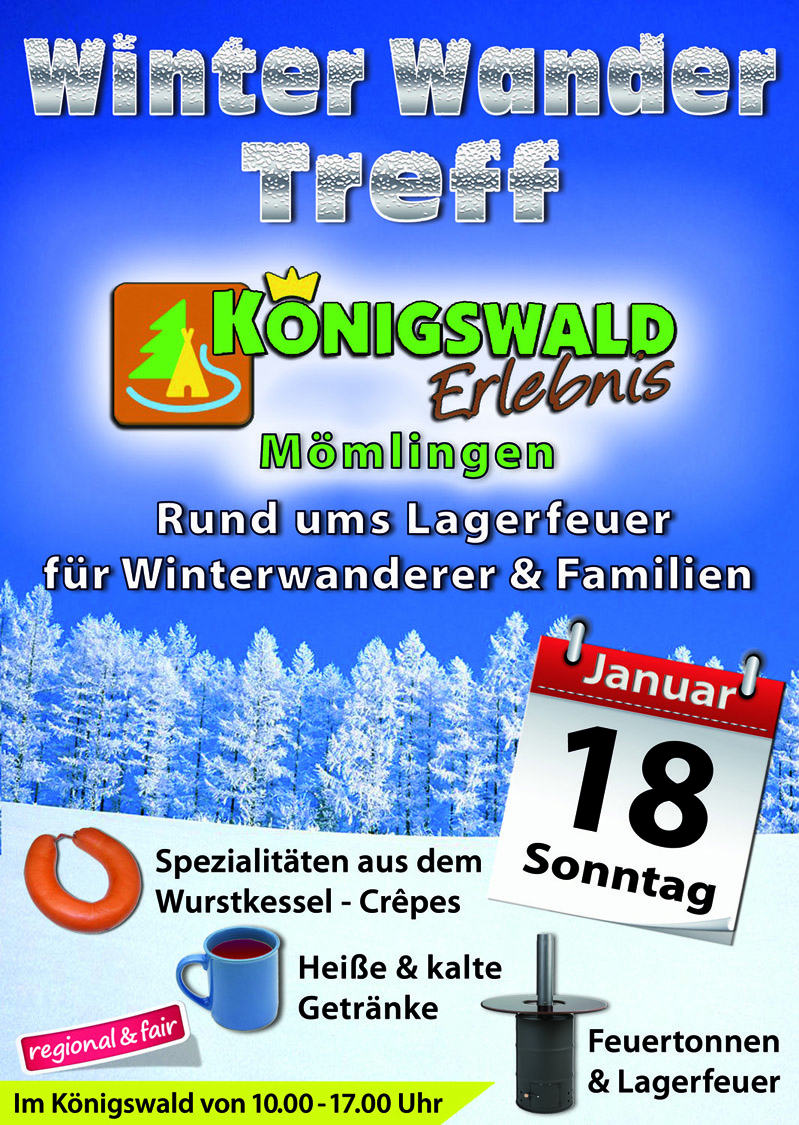 Am Sonntag, den 18.1.2026 findet der traditionelle Winter-Wander-Treff in der Freizeitanlage Königswald statt. Der Königswald begrüßt von 10.00-17.00 Uhr alle kleinen und großen Winter Wanderer mit warmen Getränken, hausgemachten Crêpes und Kaffee, sowie Spezialitäten aus dem Wurstkessel recht herzlich. Für wärmende Oasen mit Feuertonnen und Lagerfeuer ist bestens gesorgt, denn die Veranstaltung findet bei jedem Wetter statt. Unsere kleinen Wanderer dürfen sich auf Stockbrot am Lagereuer zum selber rösten freuen. Parkplätze finden Sie am Schützenhaus in der Königswaldstraße in der Nähe der Veranstaltung.